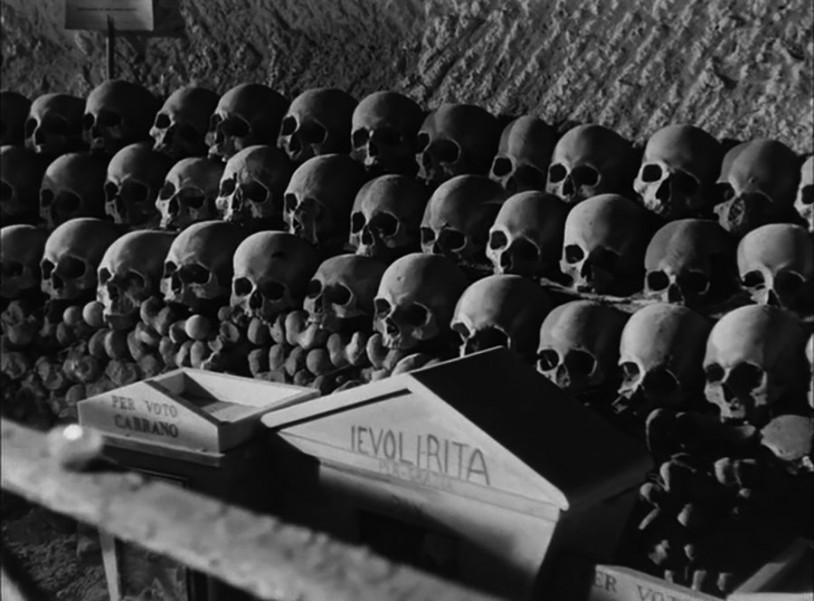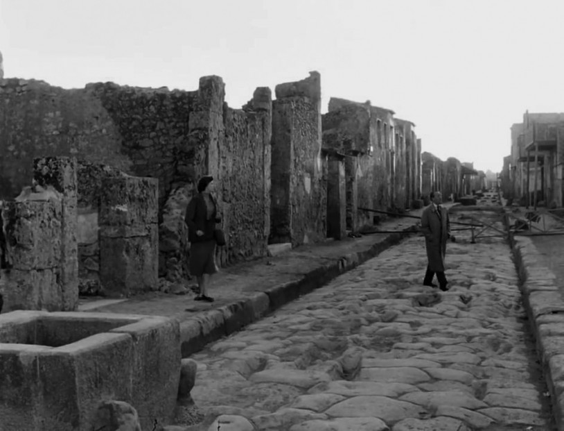 But before all these films there is another one that, at least apparently, has nothing sci-fi or mysterious about it. And that, better than any other, conveyed the dimension that I have so far tried to outline: ending up finding the perfect setting right in the hinterland of Naples. And, it is no coincidence, in what Walter Benjamin called “the porous city”, referring to the etymon that is manifest in the excavations at Pompeii (“all that the visitor desires, admires and pays is ‘Pompeii’”). There is the harrowing fencing match between the icy-cold neurotic British couple Katherina and Alex Joyce (Ingrid Bergman – formerly Hitchcock’s muse, always shown with her delicate hands well protected by gloves – and George Sanders) in Rosselini’s Journey to Italy. These were the last reincarnation of the Grand Tour travellers of yore, and the scene is set entirely in the magical enclosure with the Solfatare of Pozzuoli, the Fontanelle alla Sanità cemetery – and indeed Pompeii itself. Georges Didi-Huberman, the greatest thinker in the world of art today, referring to that old page written by Benjamin, exemplified his anachronistic conception of history not only of images (a conception explicitly inspired by Benjamin, as well as by Warburgh), in none other than these Neapolitan sites where we find the same stratification that Freud foretold in Rome: “As in every city that has lived many times, here they overlap, bursting into each other even physically”. Referring to the capuzzelle, the countless skulls at Fontanelle lined up in overlapping layers like terracotta armies stacked one on top of the other: “In this architecture we see violent, almost Piranesi-like shafts of light, which coexist with the shapeless loam of death, and with the carpet of bones at its base.” It is in places like these that we witness the “emergence of the heterogeneous: where different ages intertwine, and become encrusted in one another.” Here “this multiple, unclean temporality that is intrinsic in art comes to life. The forms of art always refer to a depth that is beyond, something secretly radiant that is below and that keeps on pulsating.”