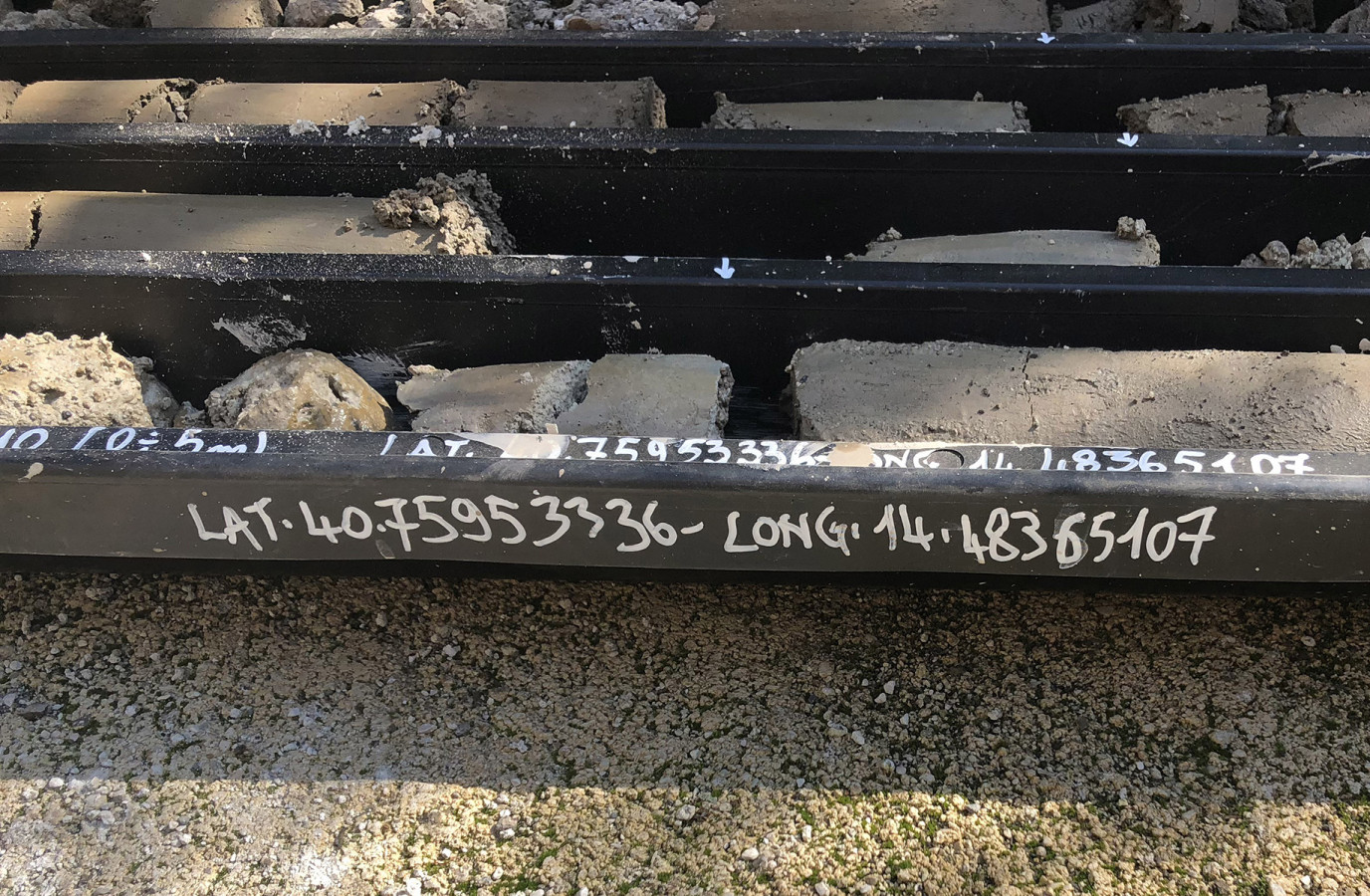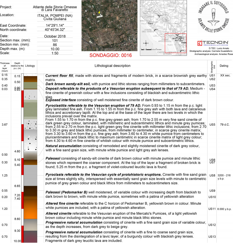 The 0016 core sampling site is in the municipal area of Pompeii, in Civita Giuliana. Unlike the coring carried out in the area of archaeological excavations, where the post-AD 79 stratigraphic sequence was removed in order to unearth the levels used during the Roman period, the 0016 core sampling goes through the entire sequence of products of the eruption of Vesuvius in AD 79 as well as through those of a more recent eruption, which is not clearly identifiable.