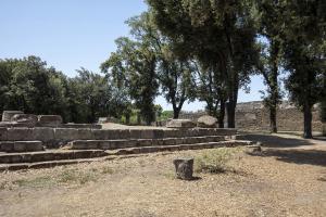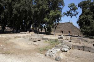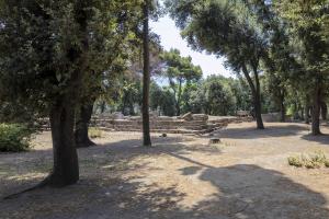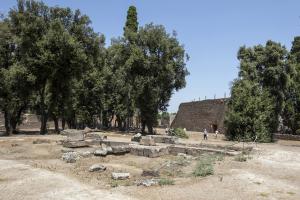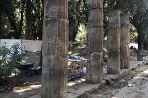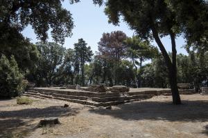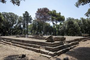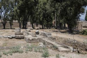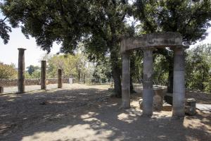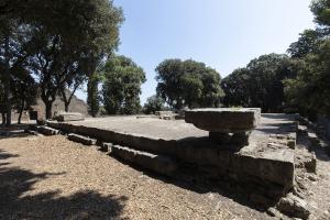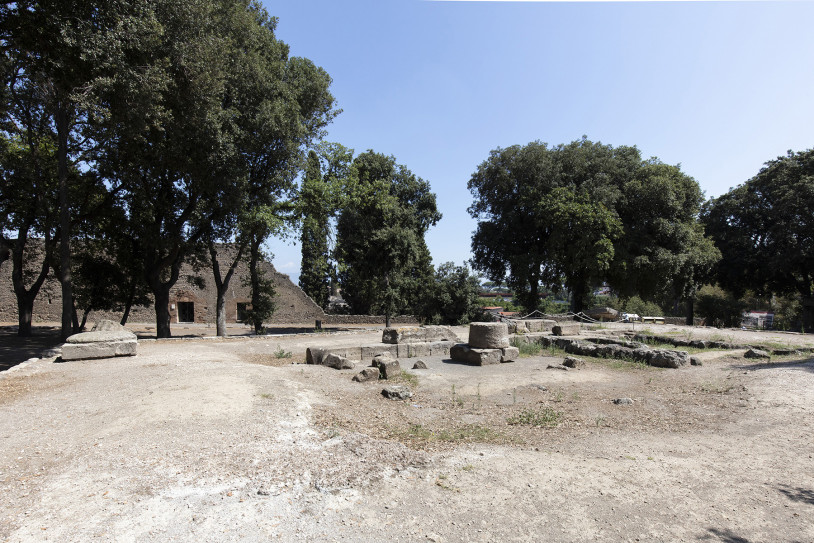 The place was used for sacred functions as early as the sixth century BC, with the construction of a Greek-style temple dedicated to Athena. The heroic cult of Hercules, to whom a heroon was dedicated, was associated with the goddess. This space, which was given monumental form in the second century BC, was redeveloped in the Augustan age with an arcade with three arms. The 100 tuff columns surround a triangular space that contains the sacred area and the Greek-style temple.
