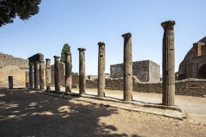 The temple was next to the so-called Triangular Forum, one of the oldest areas of archaic Pompeii, which was a very different city from that of 79 AD, with a patchy urban structure. The much older Temple of Athena, on a stretch of the lava bank that gave onto the port on the river Sarno. was located here. The temple and the entire area had profound meaning, as well as being of religious importance, and they were in a scenic position, visible from a great distance, so they were important as signalling posts for trade. The name Triangular Forum comes from the shape of the temple and of the lava bank, which could be seen to be triangular both from the land and from the sea. It is believed that, after the cult of Athena came that of Hercules, the legendary founder of the city, and that, according to some sources, his legendary heroon, or hero’s tomb, is located here. It was said that the Greek hero, returning home from one of his labours, founded Herculaneum, and was then honoured by the natives with a sacred procession, or pompa, in the place where the city would later be built, recalling in its name the memory of that ceremony: “As he was coming through Campania from Spain, Hercules made a triumphal procession (pompa) in a Campania town, and this is how Pompeii got its name.”