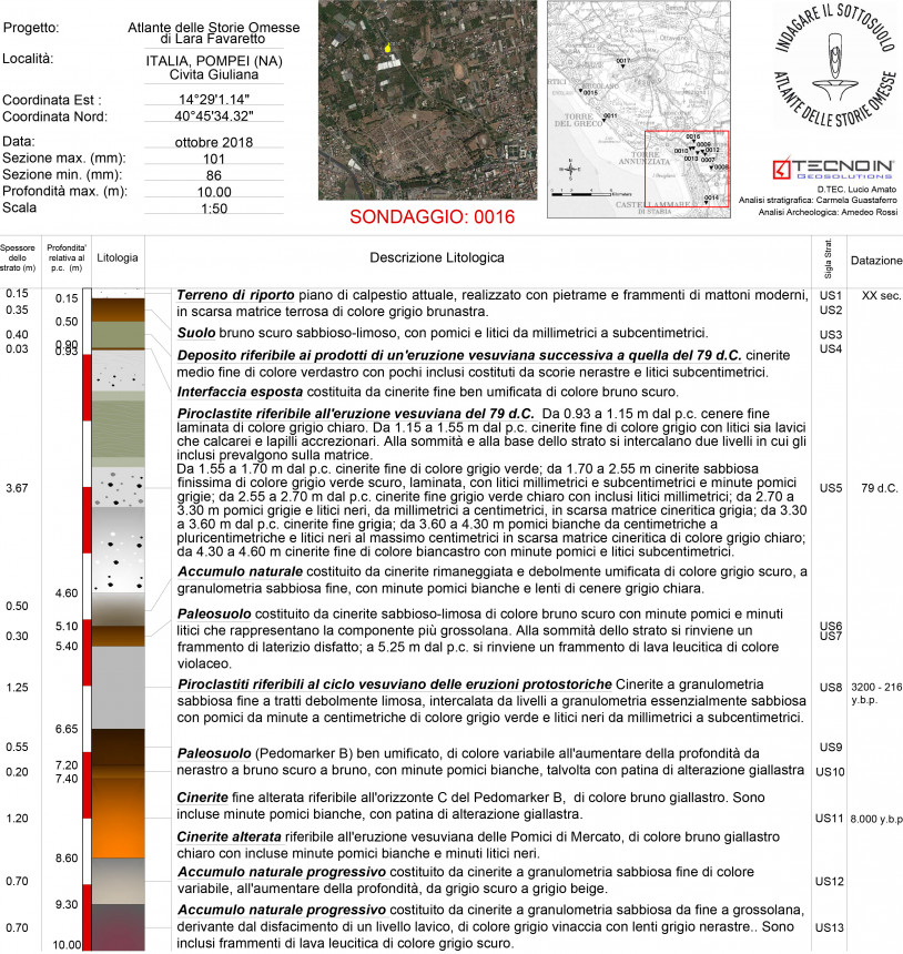 Il sondaggio 0016 è ubicato nel territorio comunale di Pompei, in località Civita Giuliana. A differenza dei sondaggi realizzati nell’area degli scavi archeologici, dove la successione stratigrafica post-79 d.C. è stata asportata per riportare alla luce i livelli di frequentazione di epoca romana, il sondaggio 0016 intercetta tutta la sequenza dei prodotti dell’eruzione vesuviana del 79 d.C. e i prodotti di un’eruzione più recente non ben identificabile.