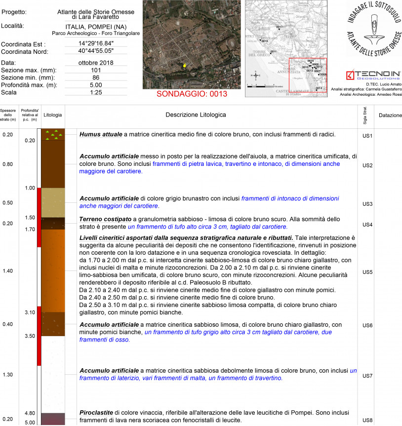 Il punto di indagine 0013 è ubicato all’interno del Parco Archeologico di Pompei, e più precisamente nell’area del Foro Triangolare, nello spazio racchiuso dal portico e davanti all’ingresso del Teatro Grande.