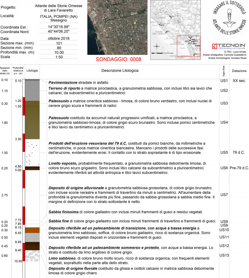 Il sondaggio 0008 è stato realizzato in prossimità del cordone dunare costiero olocenico di Messigno, il più interno ed antico della pianura alluvionale del Sarno, ed ha raggiunto la profondità di 10 m dal piano campagna.