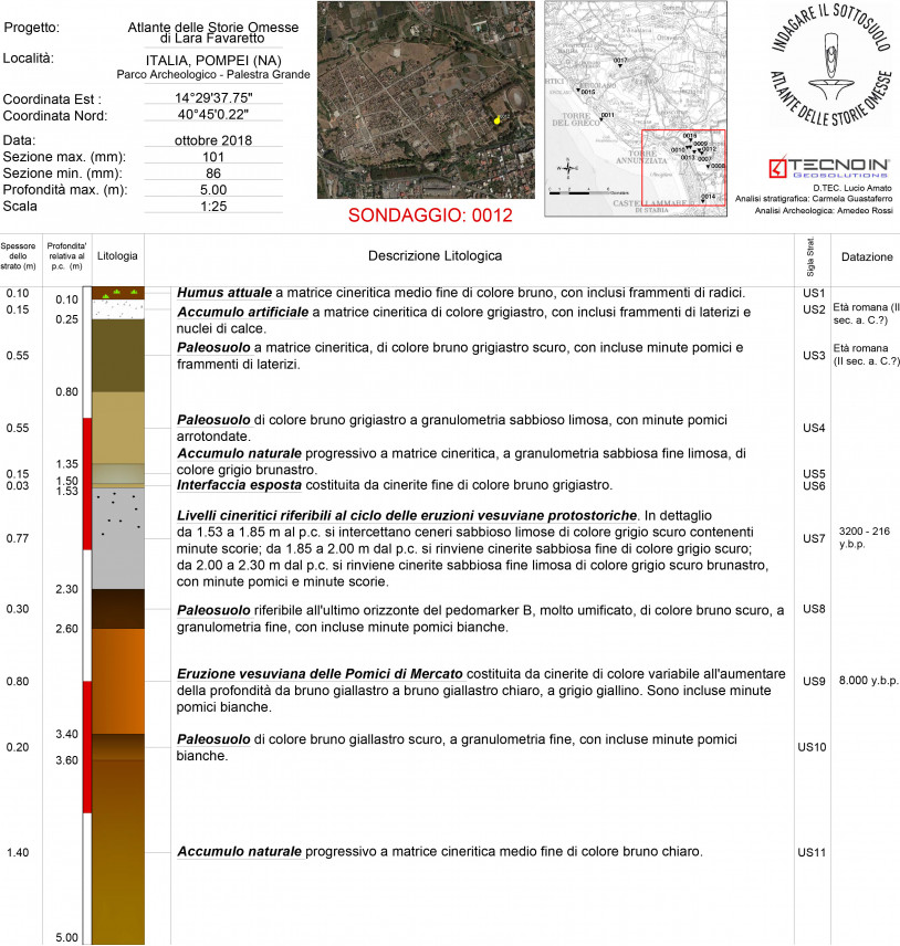 Il sondaggio 0012 è ubicato all’interno del Parco Archeologico di Pompei, e più precisamente in prossimità dell’angolo sud-ovest del portico della Palestra Grande.
