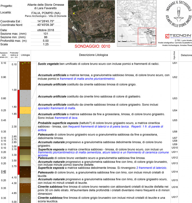 Il punto di indagine 0010 è ubicato all’interno del Parco Archeologico di Pompei, in prossimità della Villa di Diomede, e più precisamente nel settore esterno a Porta Ercolano, dinanzi al portico situato lungo il versante nord-orientale della strada di via dei Sepolcri. La penultima bottega (n. 29), presso cui è stato ubicato il sondaggio, è stata identificata come il laboratorio di un vasaio, collegato ad altri ambienti di lavorazione.