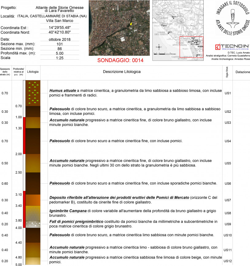 A partire dal piano campagna, il carotaggio ha intercettato l’humus del viridario (US1), che rappresenta la parte superiore di un paleosuolo policiclico intercettato per l’intero spessore indagato (5 m), intercalato da ceneri alterate di colore giallastro o bruno-arancio, che derivano da eruzioni di molti millenni prima.