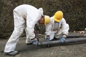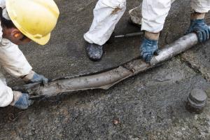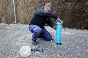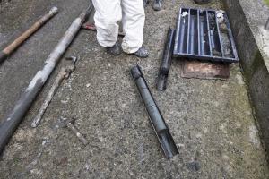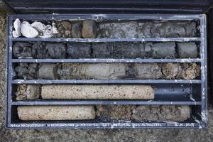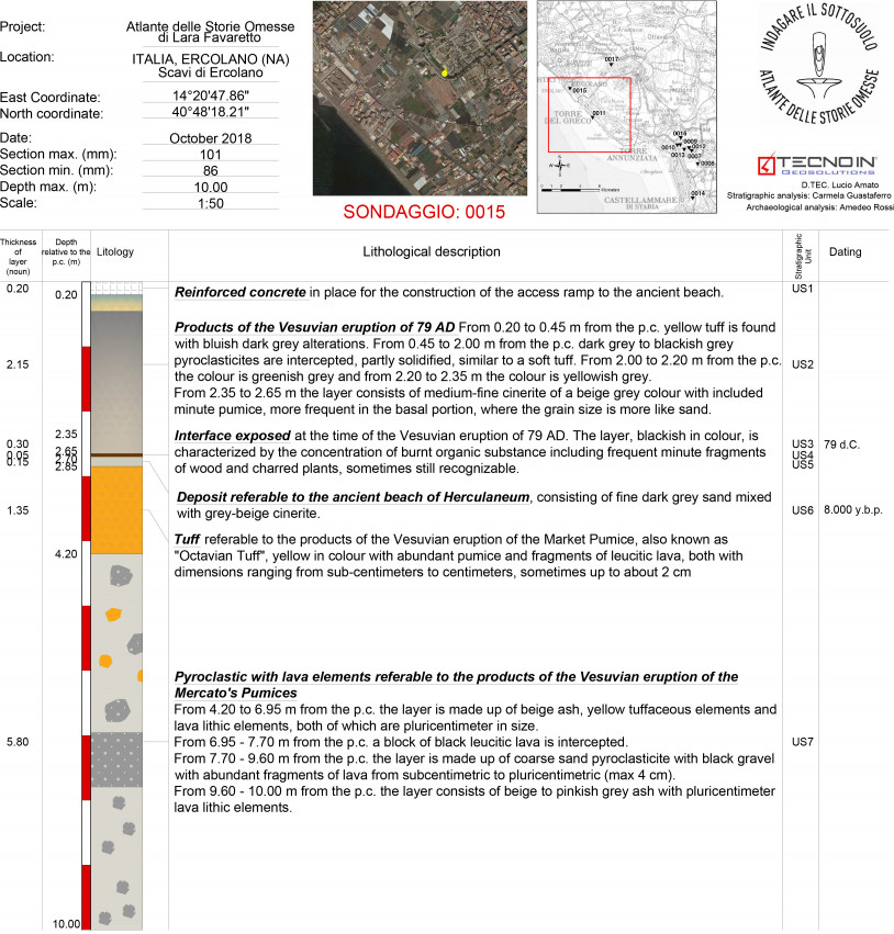 The 0015 core sampling site is in the archaeological area of the Herculaneum excavations, on the ramp that goes down to the pumping plant and to the coastal tuff platform on which the ancient beach had formed. Straight cuts and grooves on this platform have been identified as traces of ancient quarrying activities for the extraction of blocks of tuff used for building the city. Where it has been uncovered by archaeological excavations, the tuffaceous platform, which was once out of the water, is now about 6.5 m below sea level due to the subsidence of the ground caused by volcanic-tectonic phenomena. A pumping system removes the groundwater, which would otherwise fill the area.