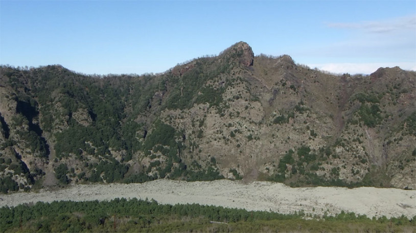 Fig. 3. The escarpment of the caldera on Monte Somma. The light grey lava flow of the 1944 eruption can be seen at the foot of the escarpment. The rocks produced during the ancient activity of Monte Somma, consisting of lava flows and scoria from low-energy explosive activity, can be seen in the escarpment, which formed as a result of the calderic collapse. At the centre is Punta Nasone, which is also visible in Fig. 1.