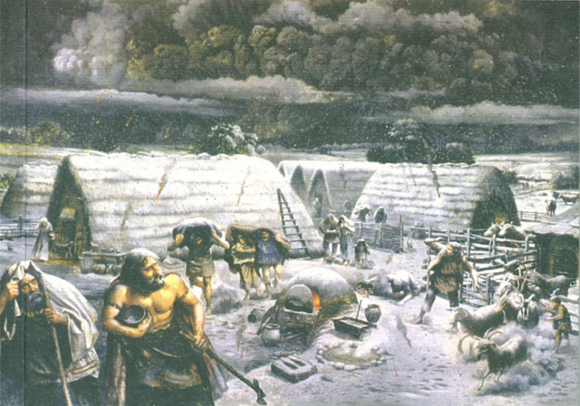 Fig. 4. Reconstruction of life in an Early Bronze Age village at the moment of the Early Bronze Age eruption of Vesuvius (modified from the cover of Il villaggio del Bronzo Antico di Nola, Litografia Sicignano, Pompeii, 2005).