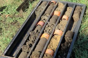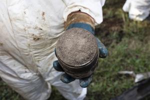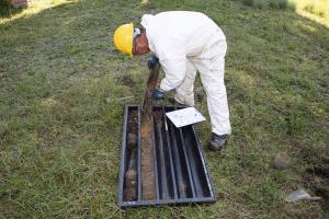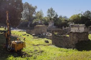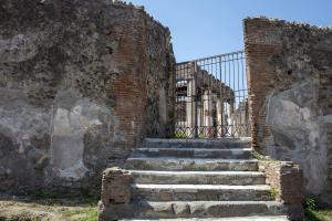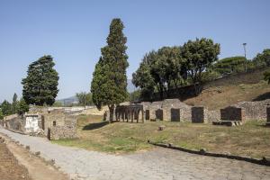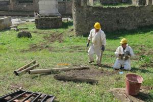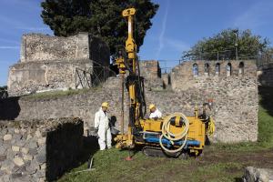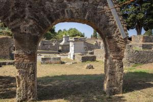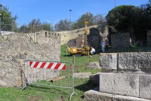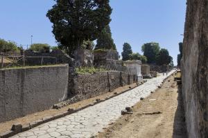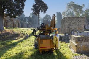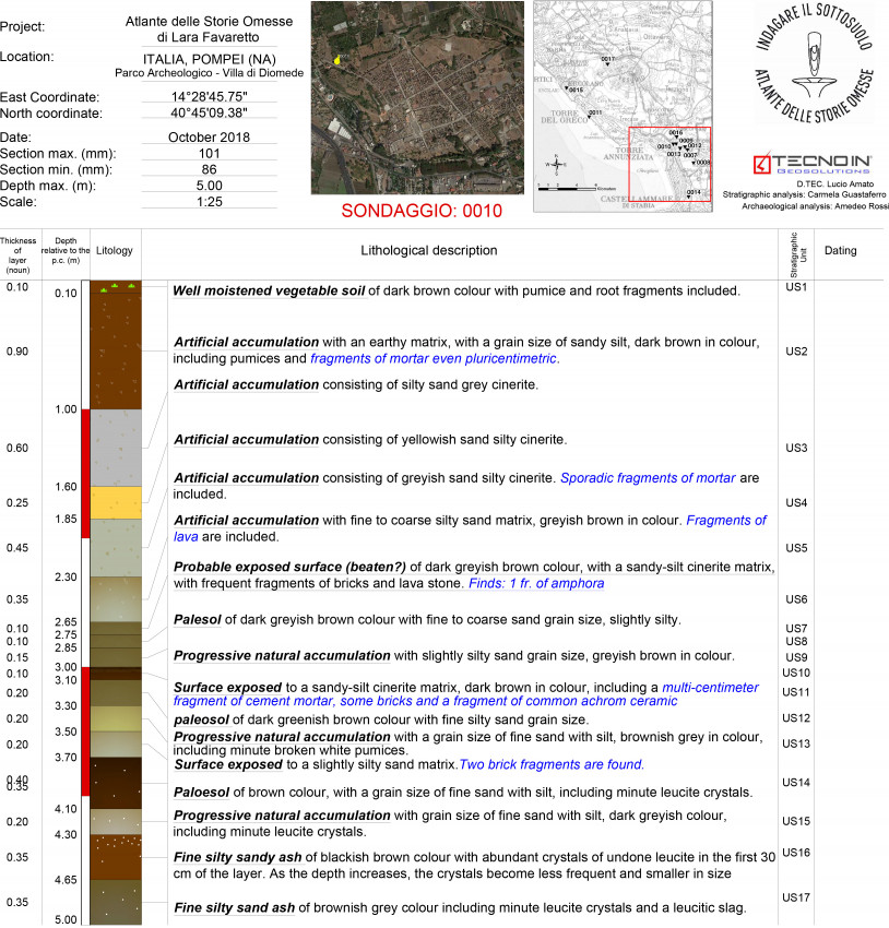 Down to -2.65 m below ground level, the 0010 core sampling site contains a series of artificially accumulated ground levels (UUSS 2-6) of the present age. These were laid during the original excavations and by the 1943 bombing raid, which was followed by several operations to arrange the area. These layers cover a man-made compacted earth surface at -2.65 m below ground level (US 7); other tamped levels are found at -3 (US10) and -3.5 m (US 13). These may be from different periods of use as a road on the south-east, found in a stratigraphic sample carried out in 2016. This showed that, during a previous period, the Via dei Sepolcri had gone in a different direction from the current one, probably due to the agricultural divisions adopted in the area north of Pompeii, which are still preserved in the orientation of the suburban Villa of Diomedes and Villa of Mysteries.