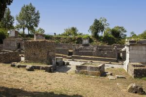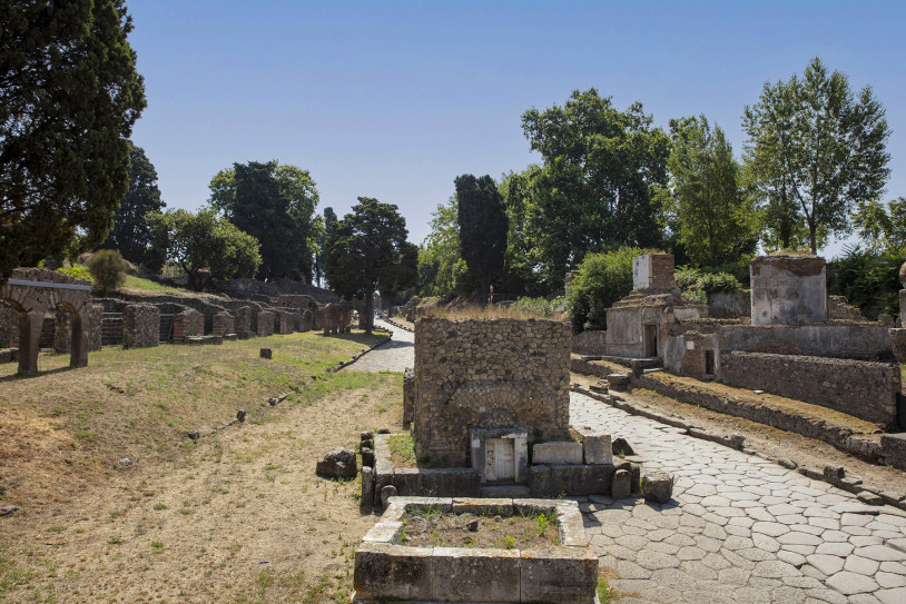 During the 2015 excavation campaign conducted by French archaeologists from the J. Bérard institute, three casket-type tombs in Sarno limestone were found to the west of the shops The finds showed evident alterations made in the nineteenth and twentieth centuries, when the area was first excavated, and then by bombing in 1943, definitively compromising the most recent stratigraphy. The burials, for example, were covered with a layer of grey clay mixed with recent materials (aluminium foil, barbed wire, etc.). This layer rests directly on a yellowish-brown silty substrate.